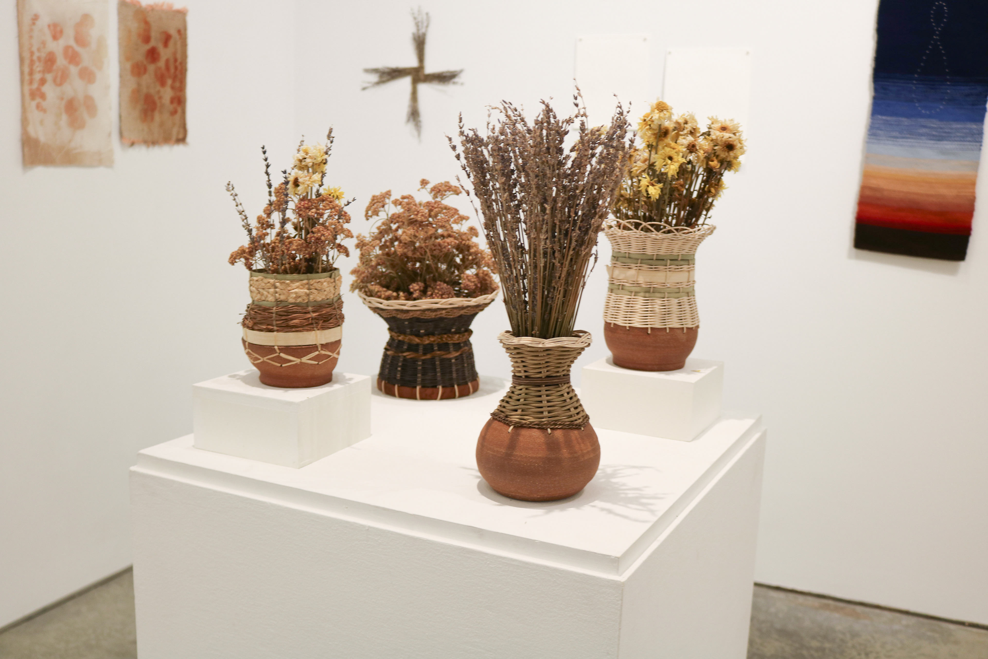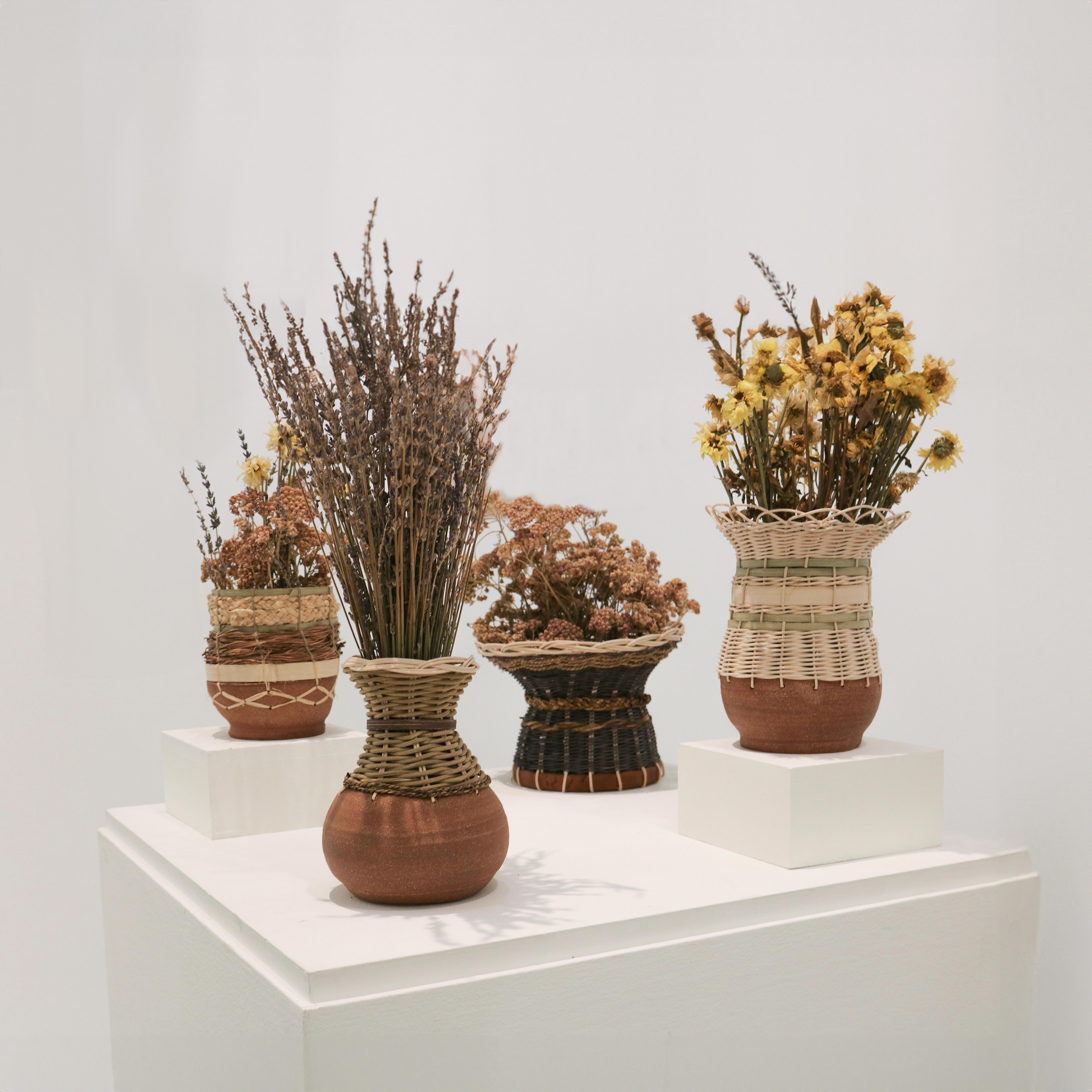 Combinations of round reed, pine needles, raffia, and daffodil leaves on handthrown ceramic bowls. Completed during residency at the Visual Arts Center of Richmond.