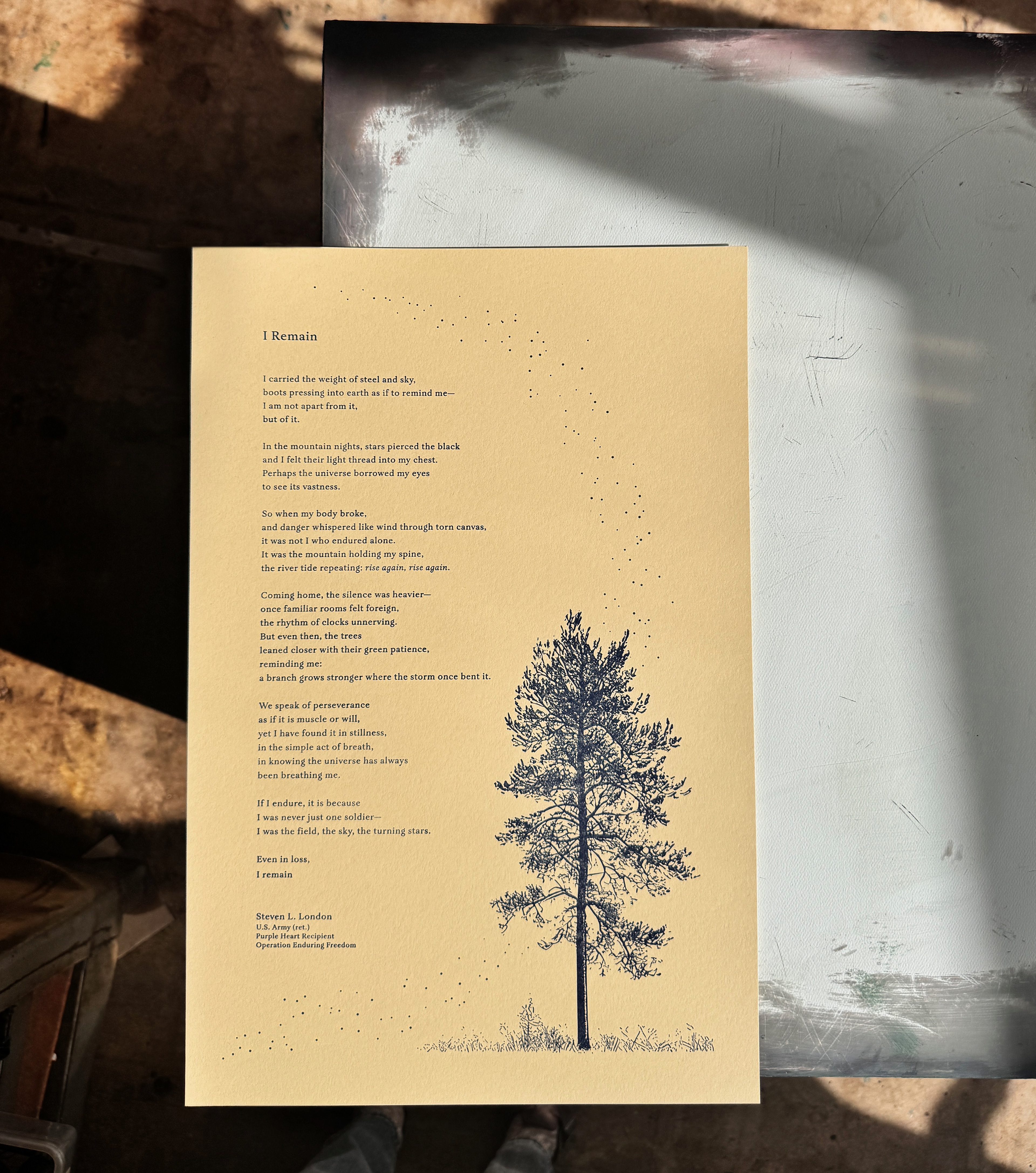 Commissioned by and in collaboration with Mattie Quesenberry Smith, the Poet Laureate of Virginia, and the Executive Director of the Visual Arts Center of Richmond, Jordan Roeder, to design and letterpress print 125 broadsides for a veteran's poetry competition, to be presented in a ceremony at the Library of Virginia in downtown Richmond.