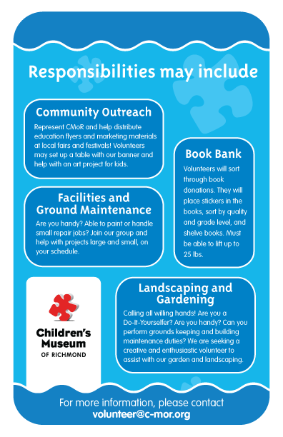 Examples of social media and signage graphics created at part of 2017 graphic design internship at the Children's Museum of Richmond