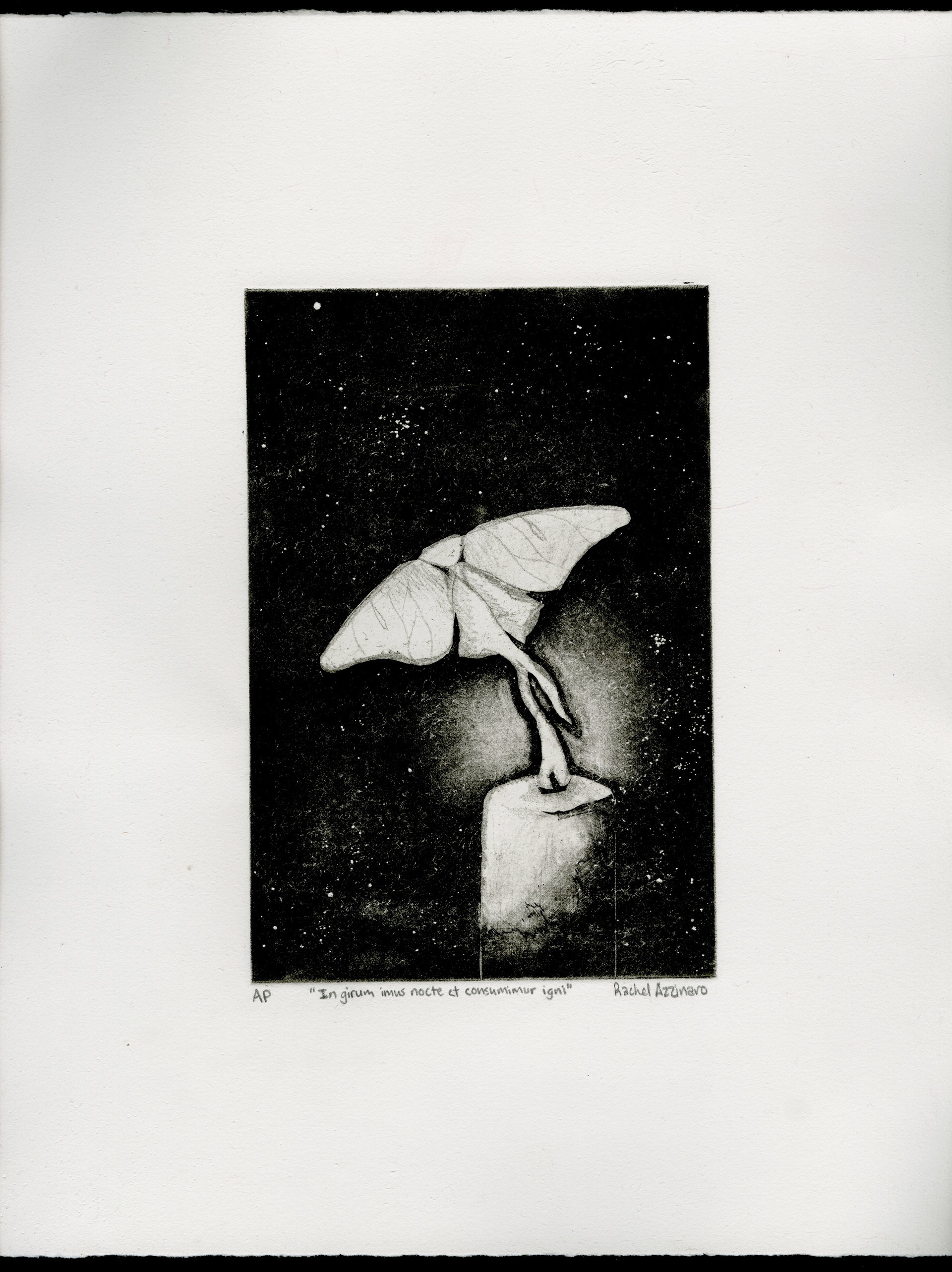 Aquatinted and soft-ground etched intaglio copperplate print. The title of the piece is a palindrome in Latin, which means "We spin in the night and are consumed by fire".