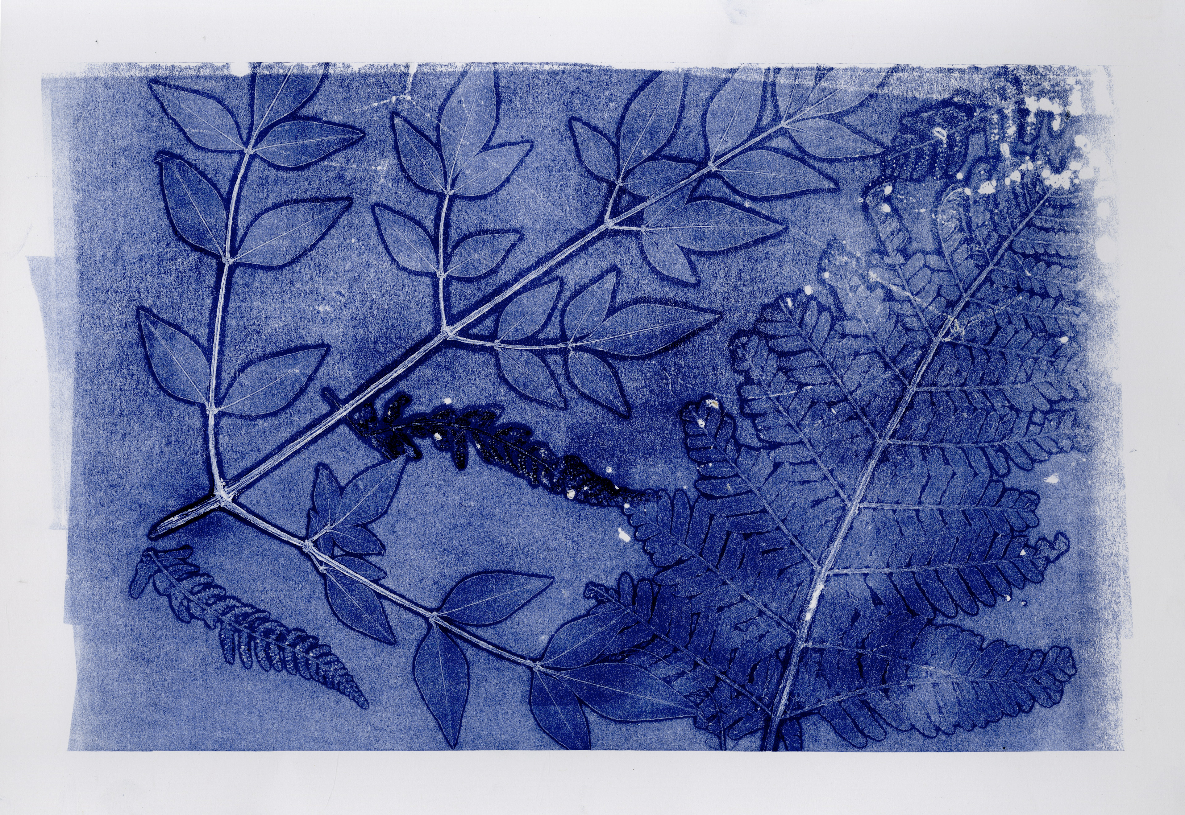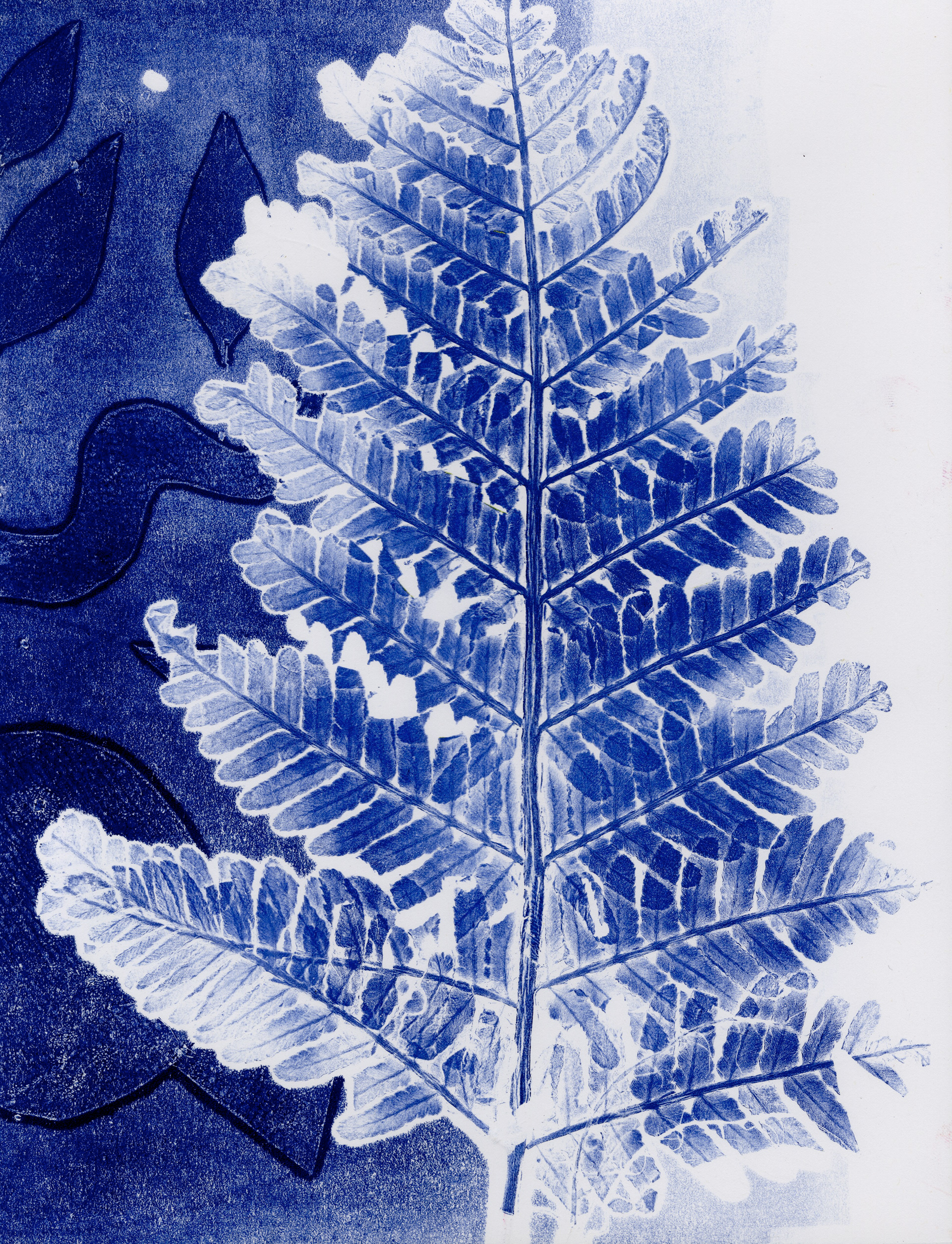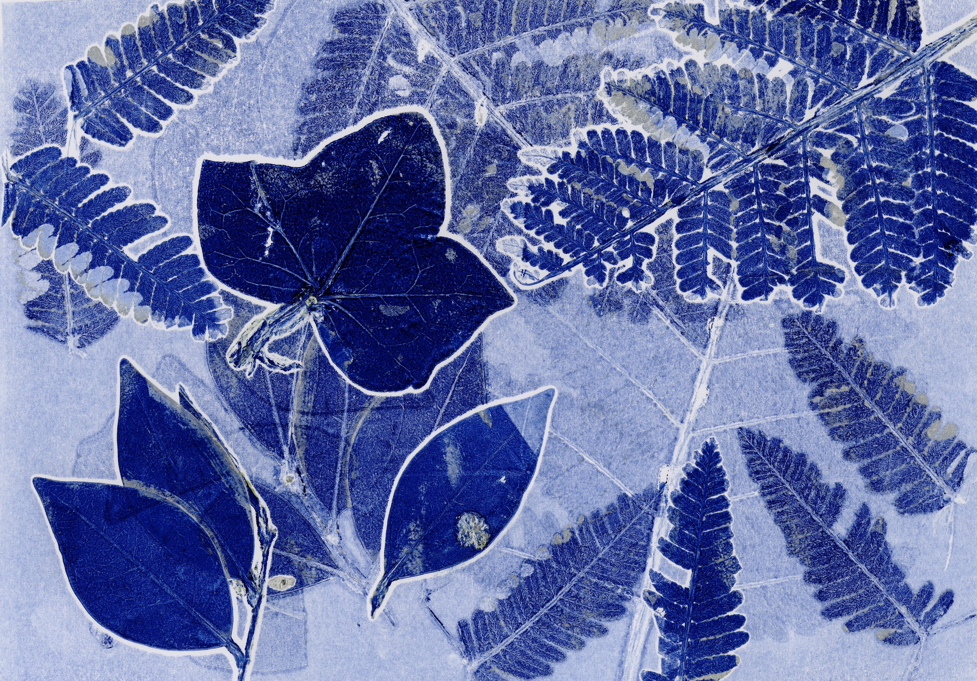 Print of live leaves and ferns, using the pochoir letterpress method with blue ink, printed on a Vandercook 4T.