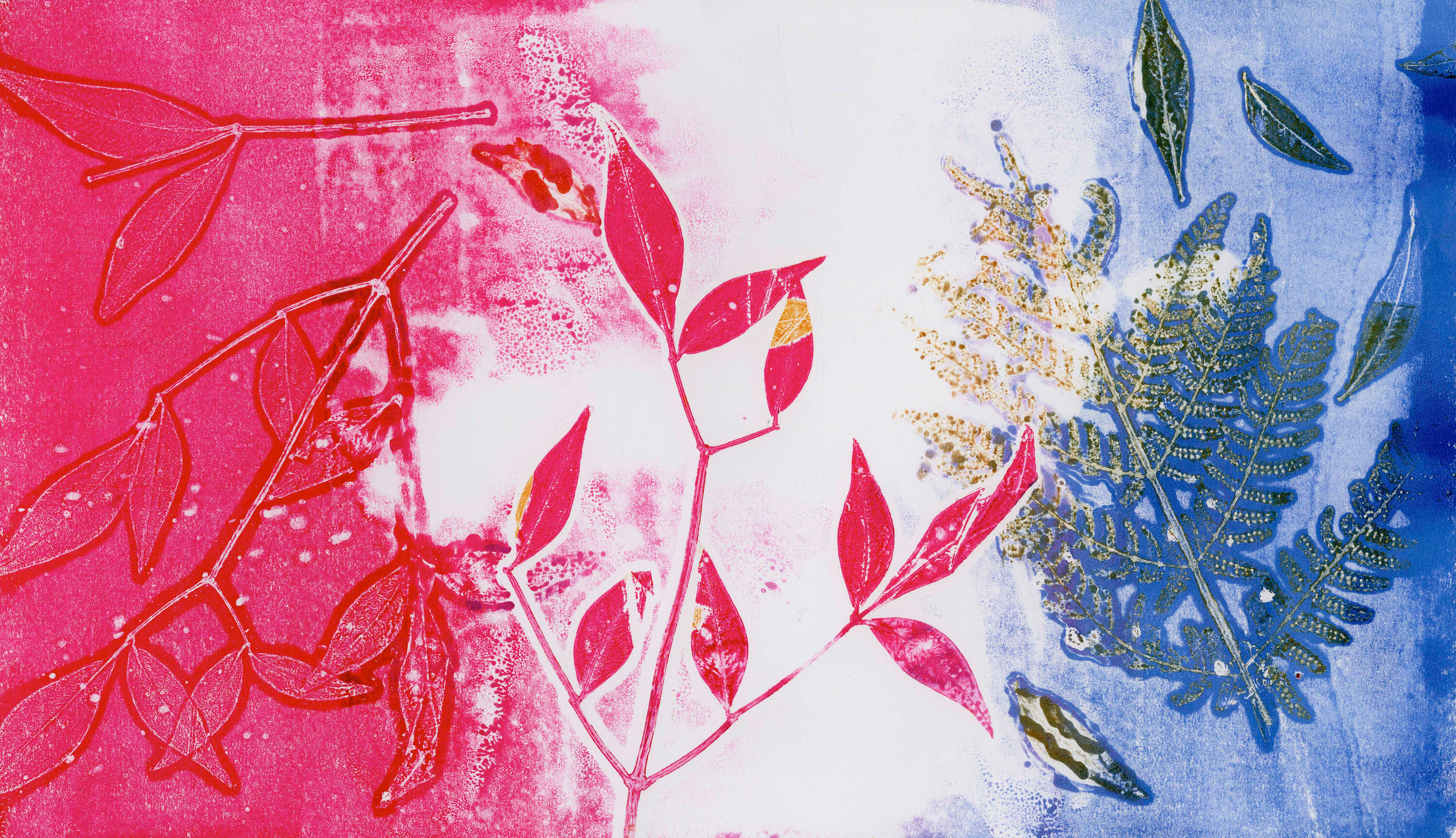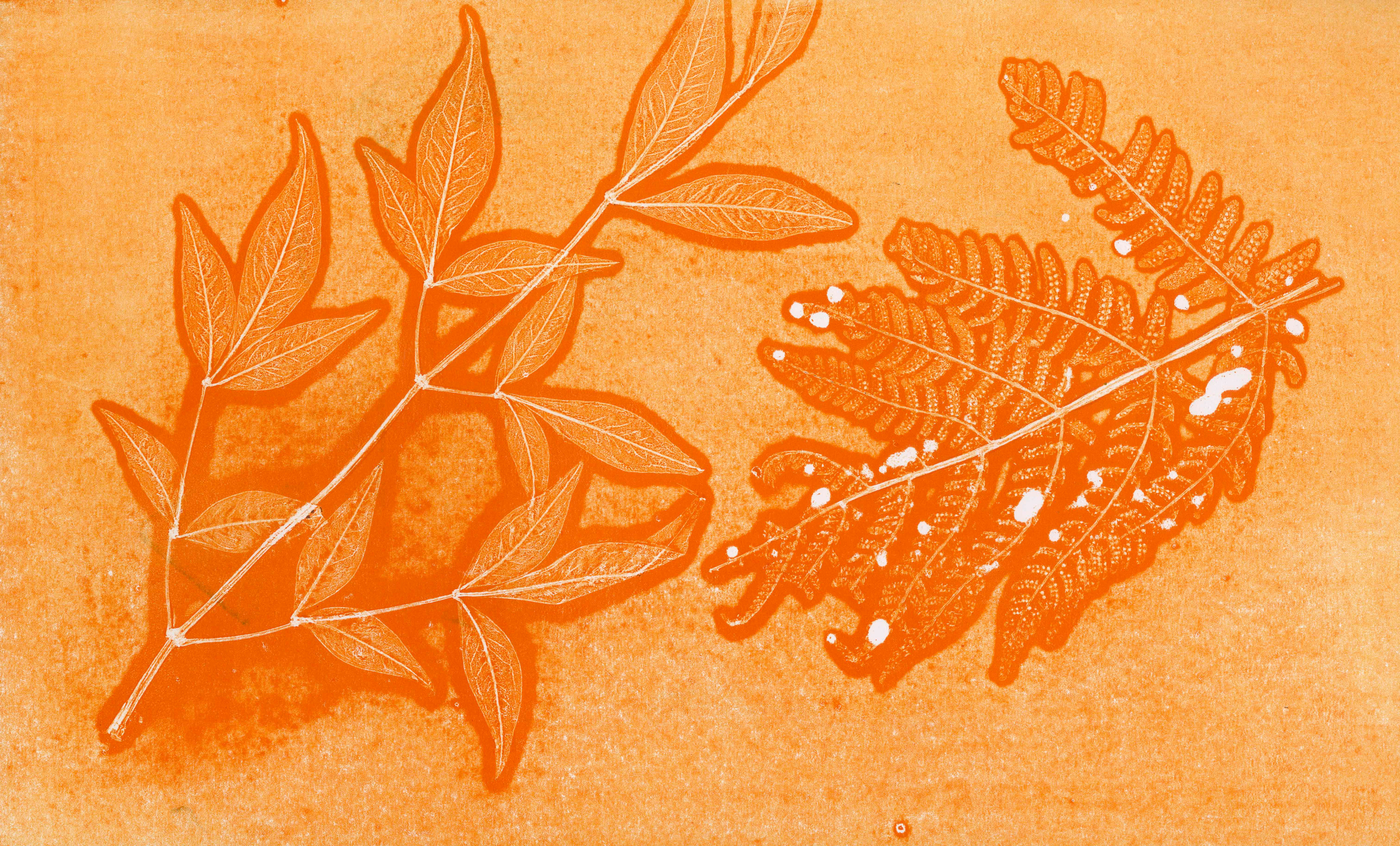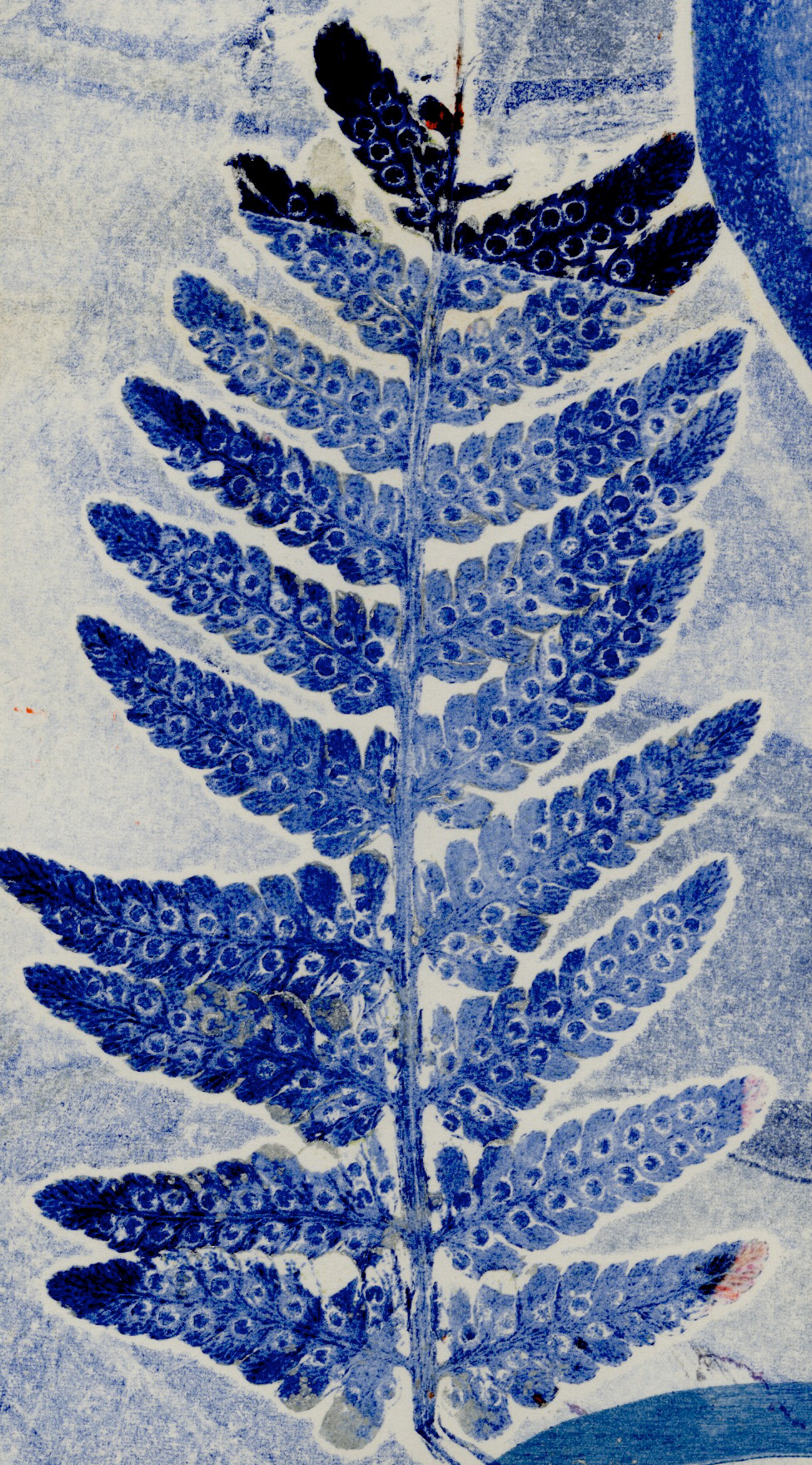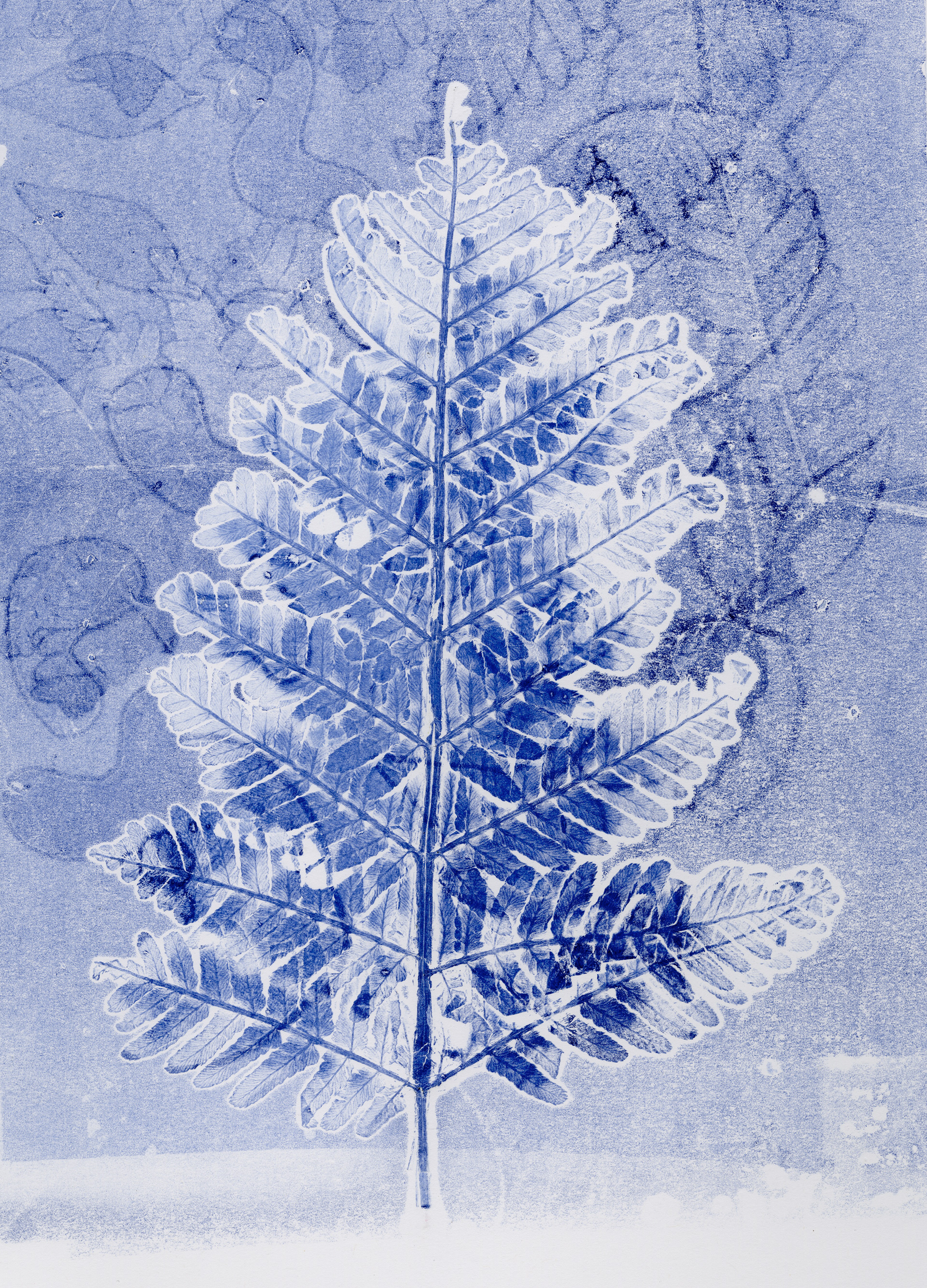 Print of live leaves and ferns, using the pochoir letterpress method with blue ink, printed on a Vandercook 4T.