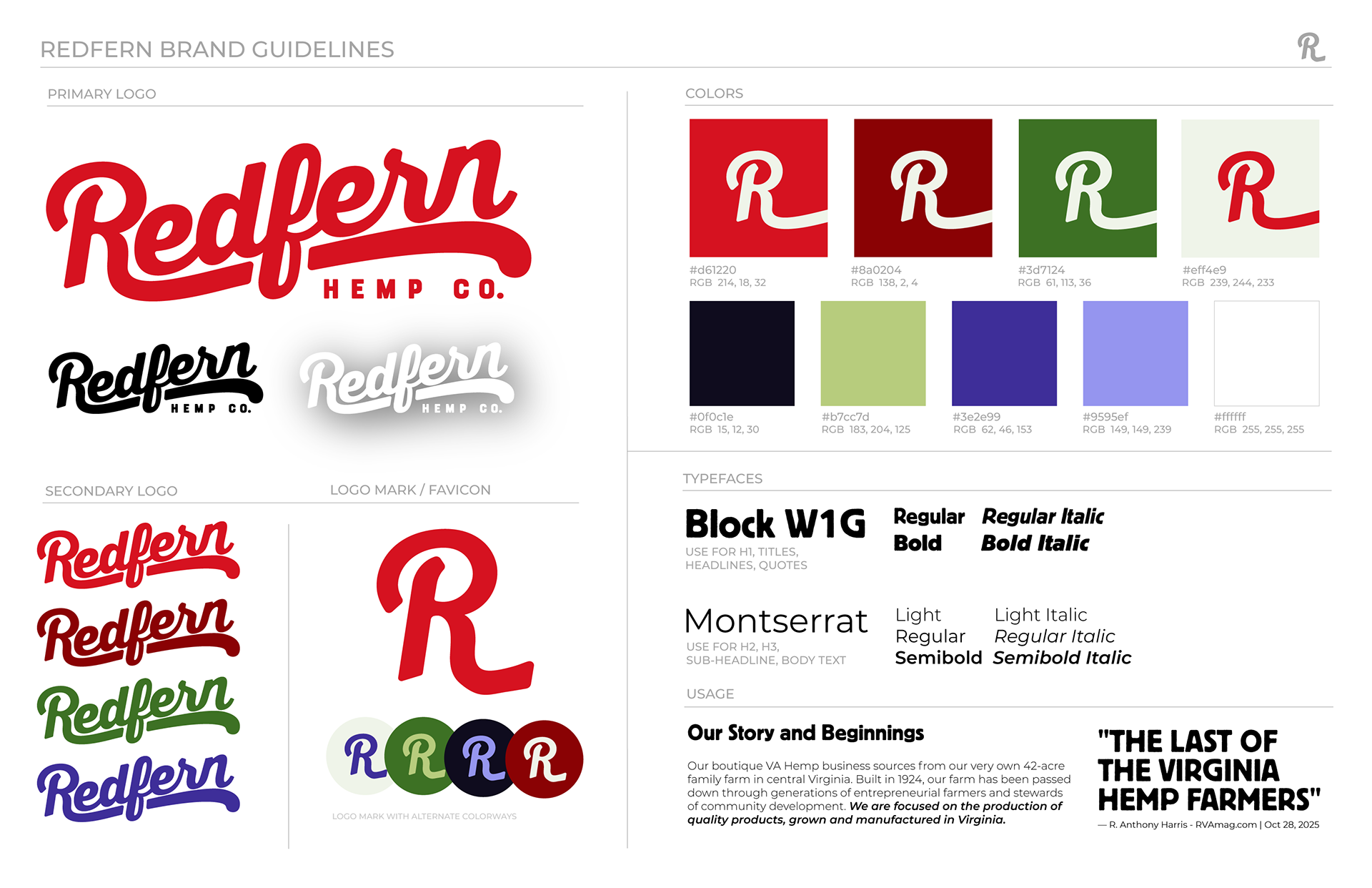 Created branding guidelines for Virginia-based Redfern Hemp Co. using existing logo but selecting color palette, typeface choice, and creating logo mark for use on future packaging, website design, and general branding. 2025
