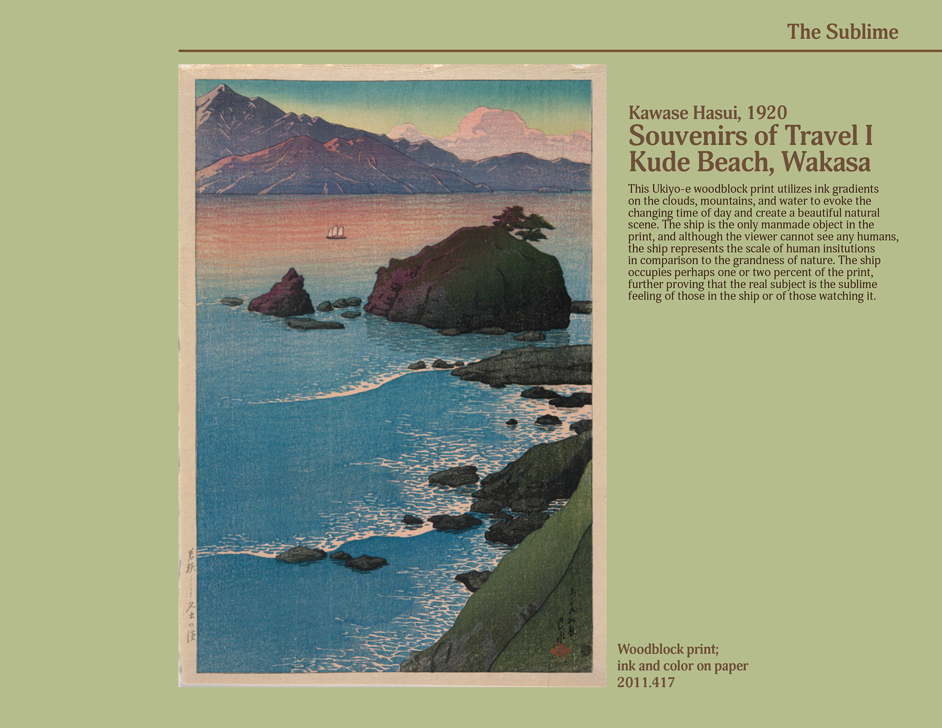 Imaginary curated art exhibition of works from the Virginia Museum of Fine Arts, based on an aspect of the human condition. My collection was based on the human instinct to be in nature, not to fulfill any biological need, but to simply experience the sublime.