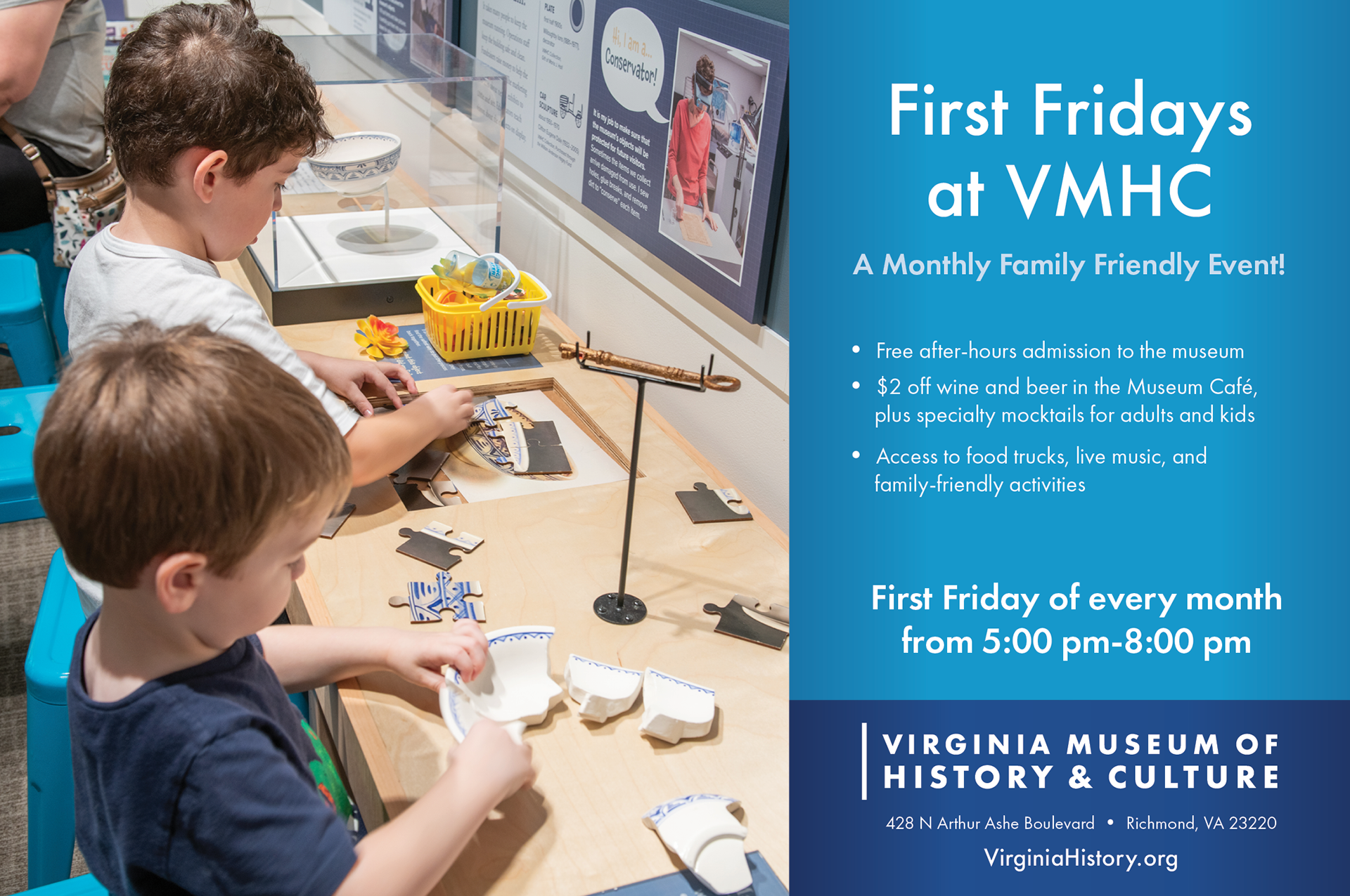 Graphics made for editorial print, web, social media, and in-house graphics made to promote the Virginia Museum of History and Culture's First Friday event, in Richmond, Virginia. All graphics made using the VMHC brand standards and guidelines.